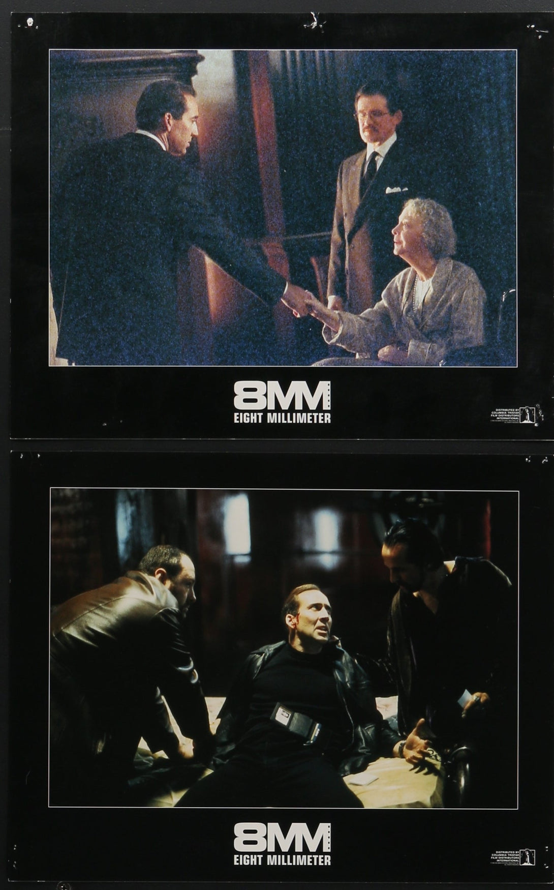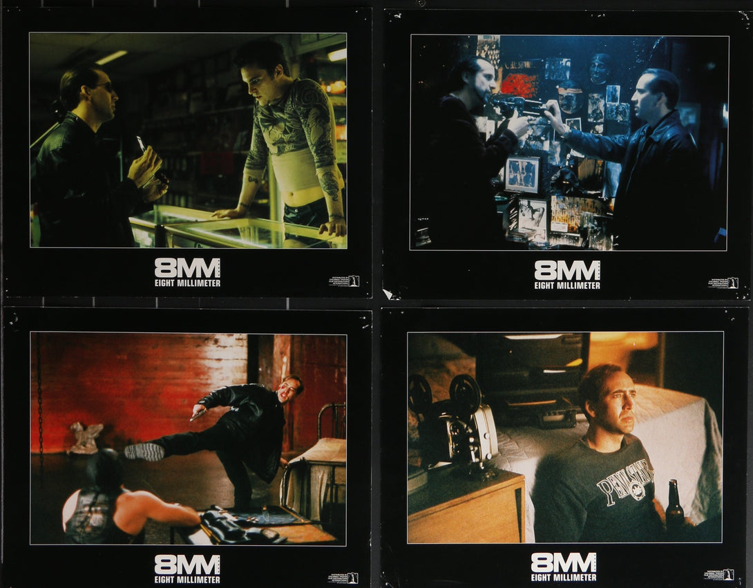 These 8 Lobby Cards measure 11" x 14" (28 x 36 cm) and advertise 8MM (Eight Millimeter), a crime thriller from 1999 directed by Joel Schumacher and featuring Nicolas Cage, Joaquin Phoenix, and James Gandolfini. The cards have creasing and pin holes.  Please not only six of the eight included are pictured.