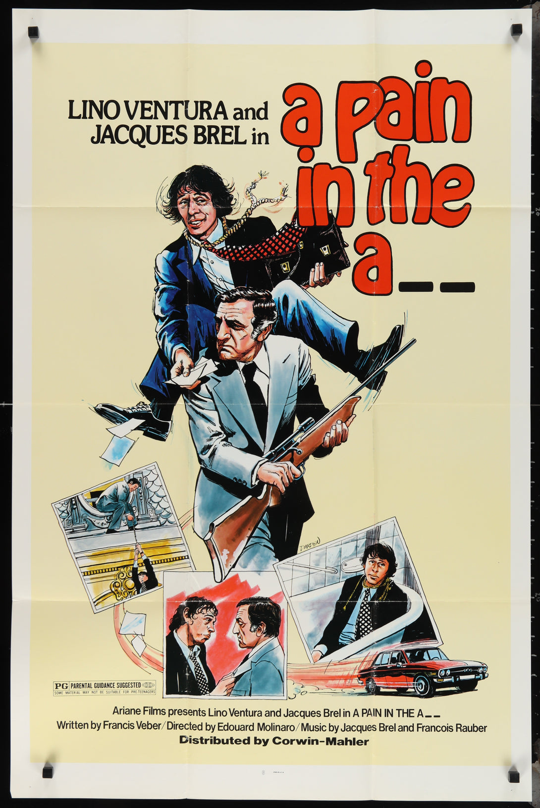 A classic Folded One-Sheet Movie Poster measuring 27" x 41" (69 x 104 cm) from the 1973 Edouard Molinaro crime comedy, A Pain in the A..., highlighting Lino Ventura. Edge and fold wear present.