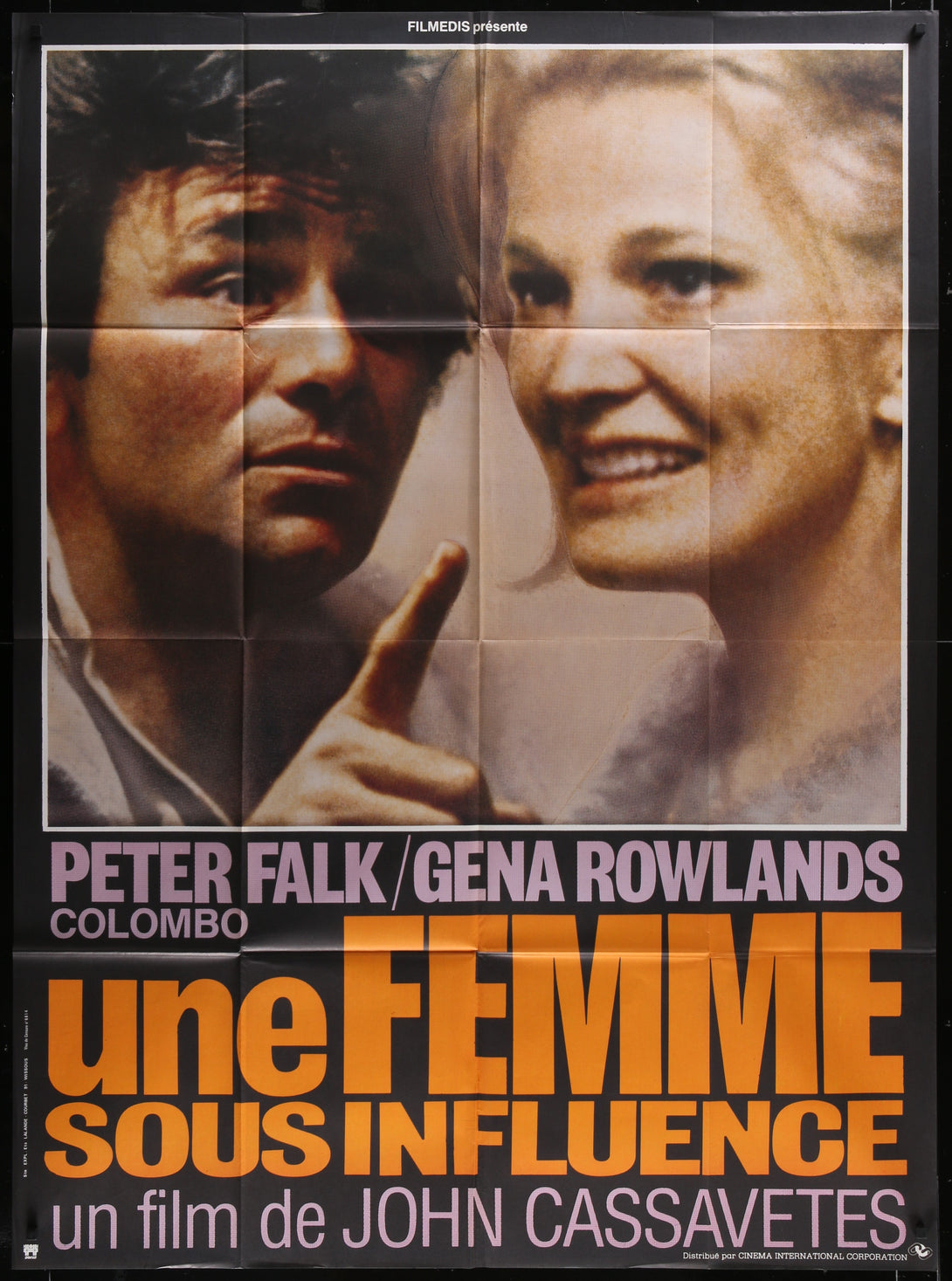 The 1976 French one-sheet movie poster for A Woman Under the Influence, featuring Peter Falk and Gena Rowlands, measures 45 3/4" x 62" (116 x 157 cm). This original, folded poster showcases the 1974 drama directed by John Cassavetes, and displays some edge and fold wear.