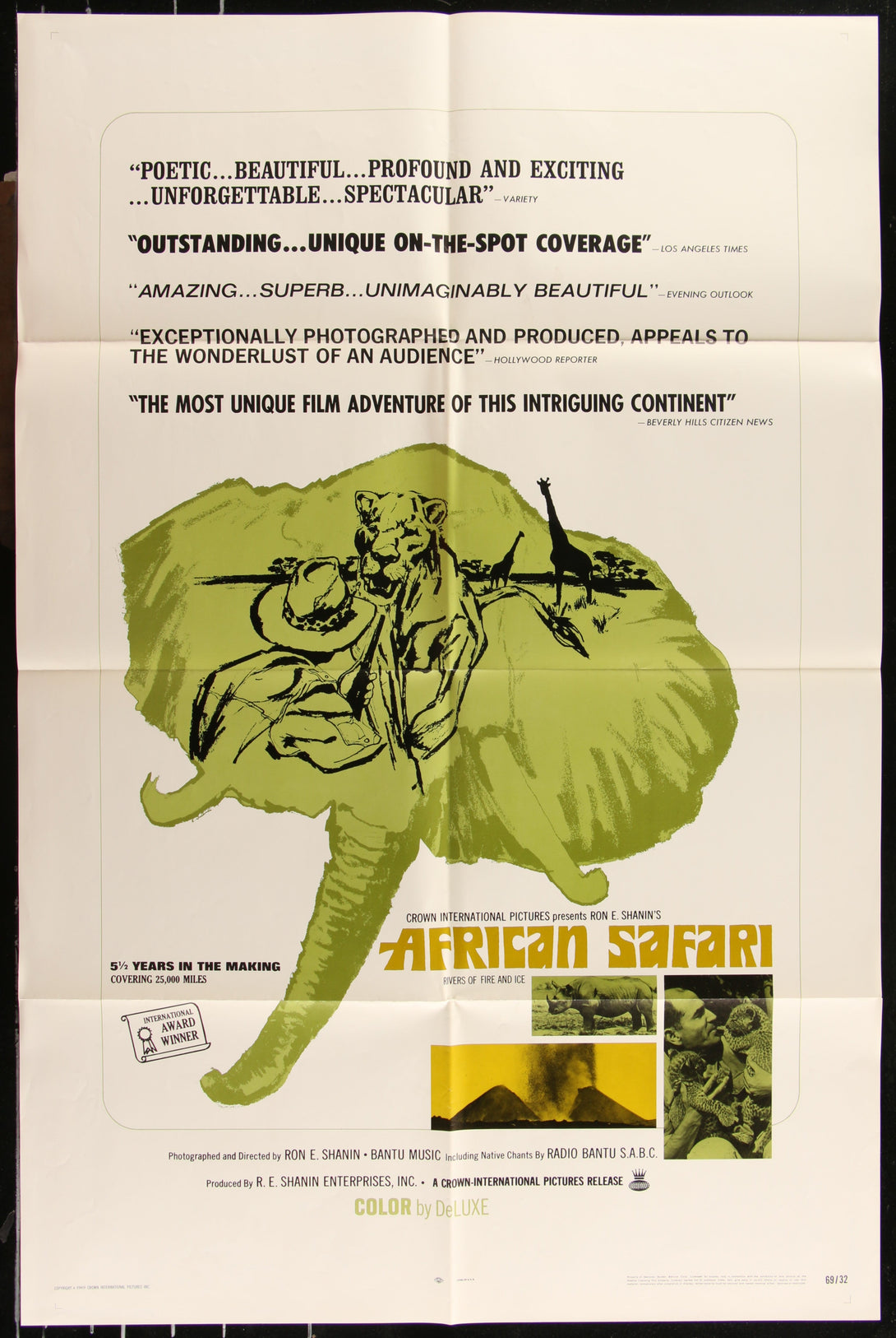 This African Safari (1969) Original US One Sheet Movie Poster measures 27" x 41" (69 x 104 cm) and features narration by Michael Rye. It has some edge and fold wear, as well as some markings.