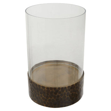 This large candle holder has an elegant cylindrical glass insert that sits above a metal base in an antique gold finish. A hammered texture adds stability to the base and creates a bling effect when the candle is lit.