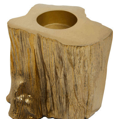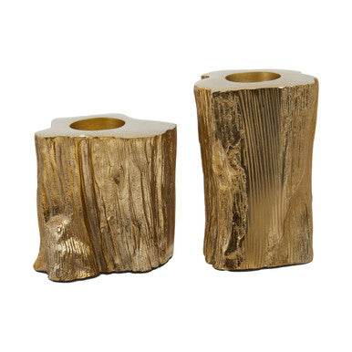 This set of two tealight holders is made from aluminium, moulded in a shape that resembles a tea trunk. The holders are finished in a luxe gold shade.
