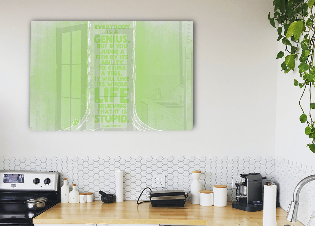 Albert Einstein Everybody Is A Genius Lime Green acrylic print, UV printed onto 5mm thick acrylic glass. Comes with everything you need to hang on your wall.