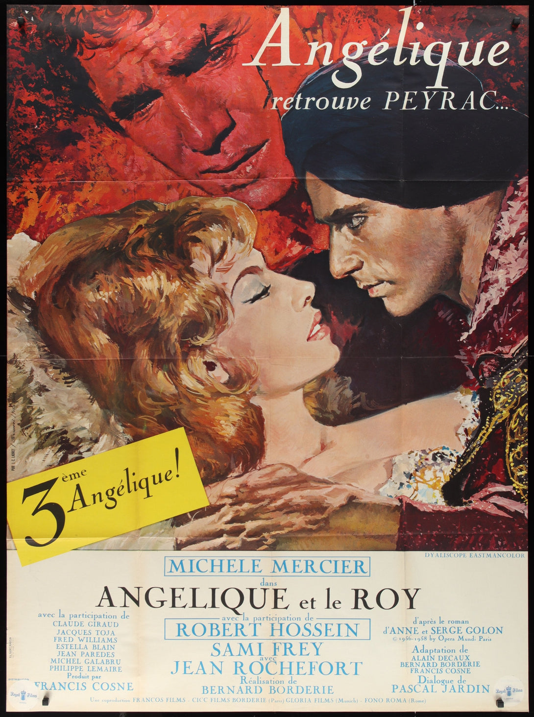 This is an authentic French "Grande" Movie Poster (46" x 62") for the 1966 romantic adventure sequel Angelique Et Le Roy, directed by Bernard Borderie and starring Michele Mercier, Robert Hossein, and Jacques Toja. Featuring artwork by Rene Ferracci and Yves Thos. The poster has some edge and fold wear, with tears around the border and folds. A sticker is also present in the bottom right corner.