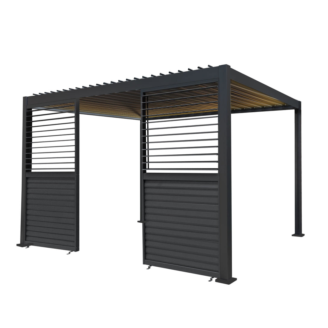 Included with this pergola are two matching louvre side panels, offering enhanced versatility. These panels can be easily adjusted to let the sun shine through when open or provide shade and privacy when closed. Made from the same anthracite finish as the structure, they create a beautifully seamless and cohesive appearance.