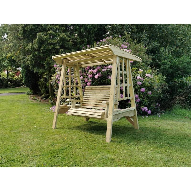 With a solid design and a stylish look, the graceful Croft Antoinette 2-Seater Swing benefits from heavy galvanized chains highly resistant to rust. Boasting deluxe ergonomic seating, this swinging bench features a slatted canopy ideal for swinging your troubles away in partial shade. Relax and enjoy the outdoors with this splendid swinging bench for two that has been designed for stability and fixed entirely with screws. Sturdily made from responsibly-sourced timber and pressure treated for greater durability. Constructed with rust-resistant galvanised zinc bolts. A product proudly made in Great Britain. Pallet delivery. This product comes delivered part assembled on a wooden pallet with a screw pack and relevant assembly instructions.