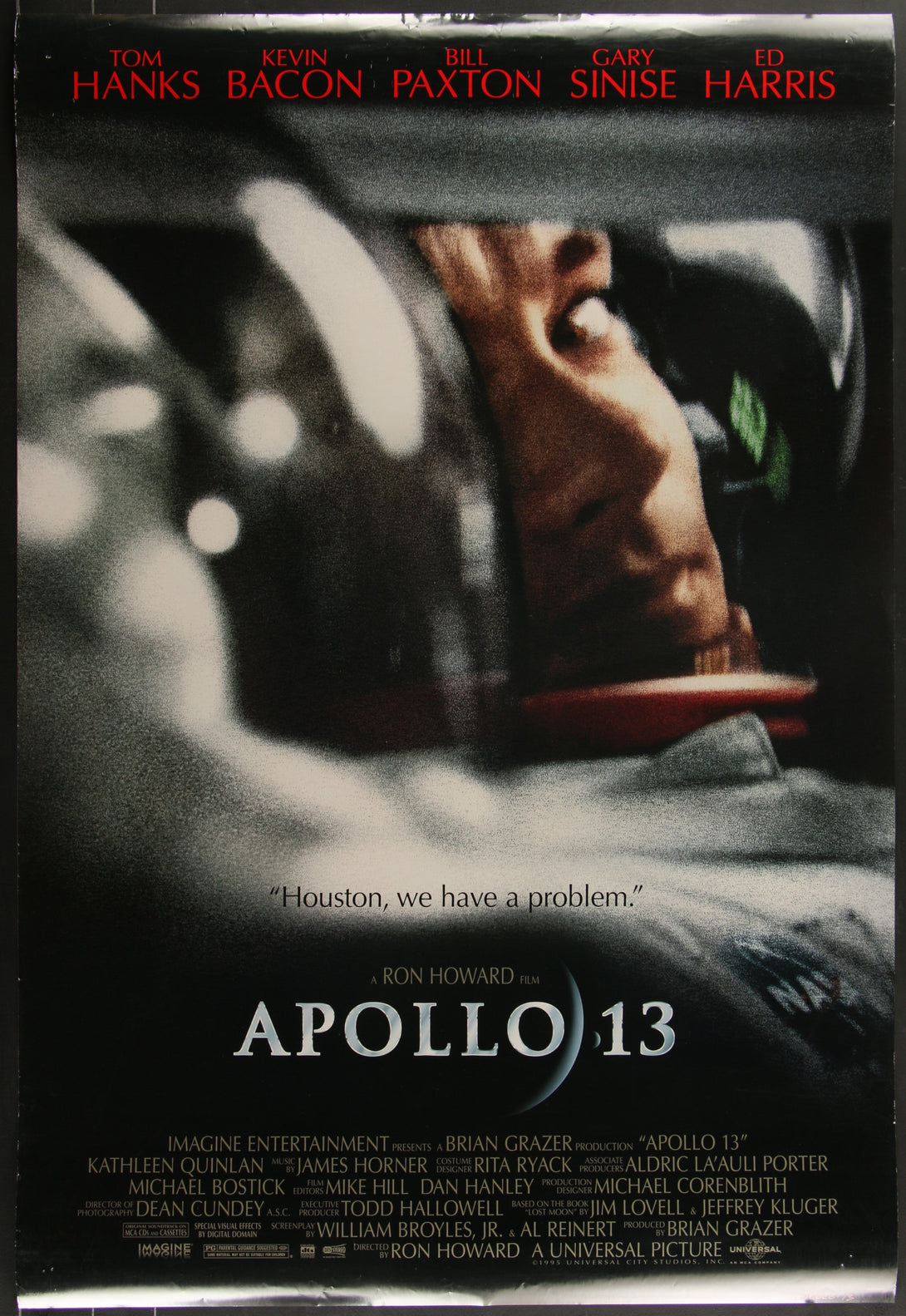 An unfolded one-sheet movie poster (68 x 101 cm) for Apollo 13, the 1995 Ron Howard space drama starring Tom Hanks, Kevin Bacon, Bill Paxton, Gary Sinise and Ed Harris. edge wear with creasing around the border. Some scuffing across the top of the poster. Pin holes.