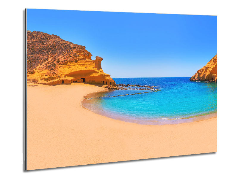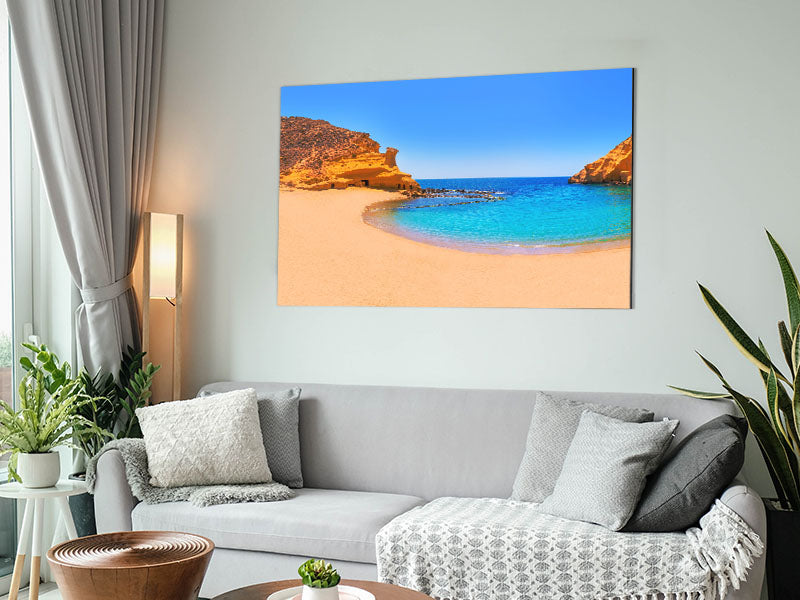 Beach cove blue seas Printed on brushed aluminium dibond. A modern way to display art and easy to maintain.