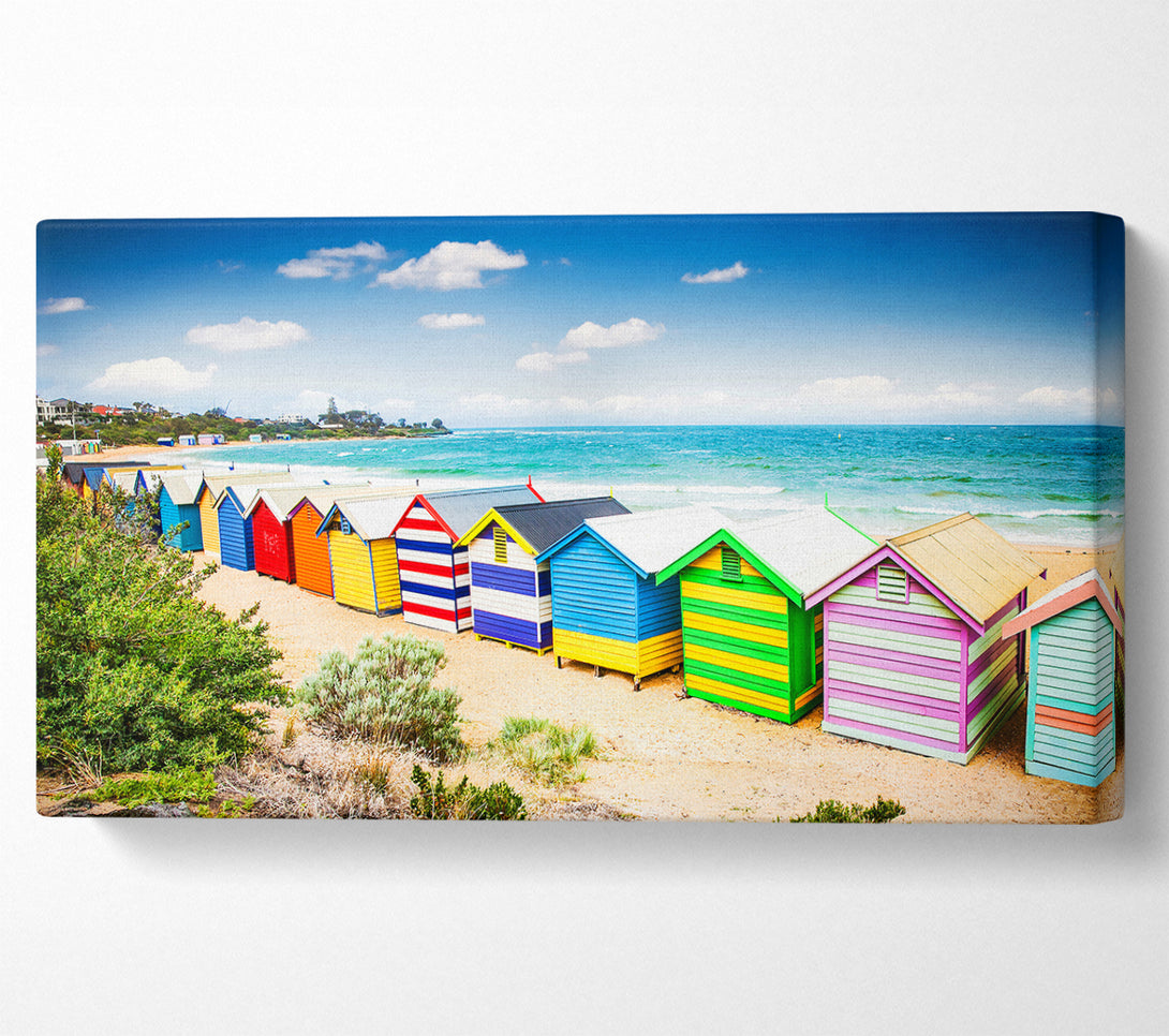 Beach Hut Delight wide canvas, printed on coated polyester canvas. Mounted on to a 44mm box frame, ready to hang.
