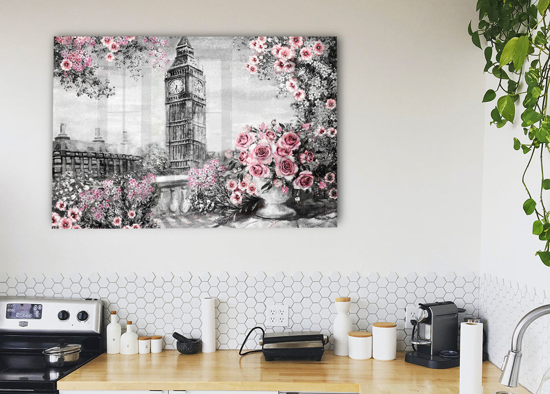 Big Ben Pink Roses acrylic print, UV printed onto 5mm thick acrylic glass. Comes with everything you need to hang on your wall.