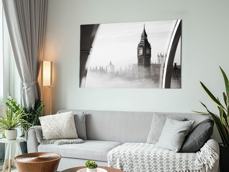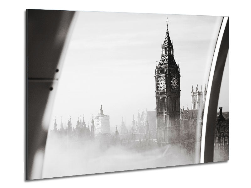 Big Ben Through The London Eye Mist Printed on brushed aluminium dibond. A modern way to display art and easy to maintain.