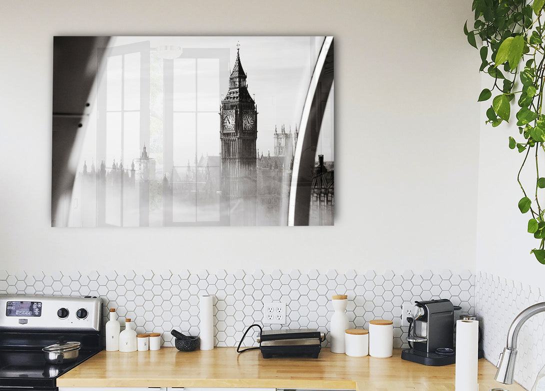 Big Ben Through The London Eye Mist acrylic print, UV printed onto 5mm thick acrylic glass. Comes with everything you need to hang on your wall.