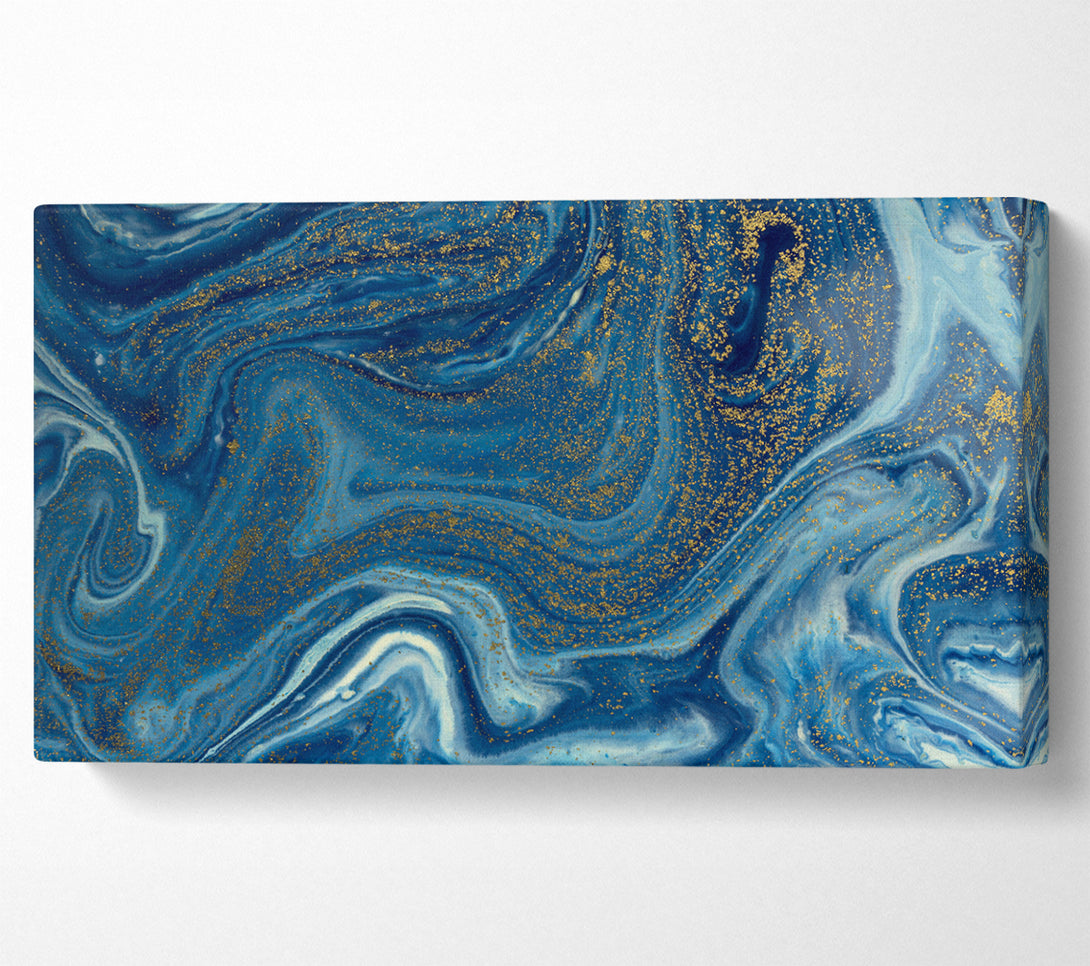 Blue Glitter Flow wide canvas, printed on coated polyester canvas. Mounted on to a 44mm box frame, ready to hang.