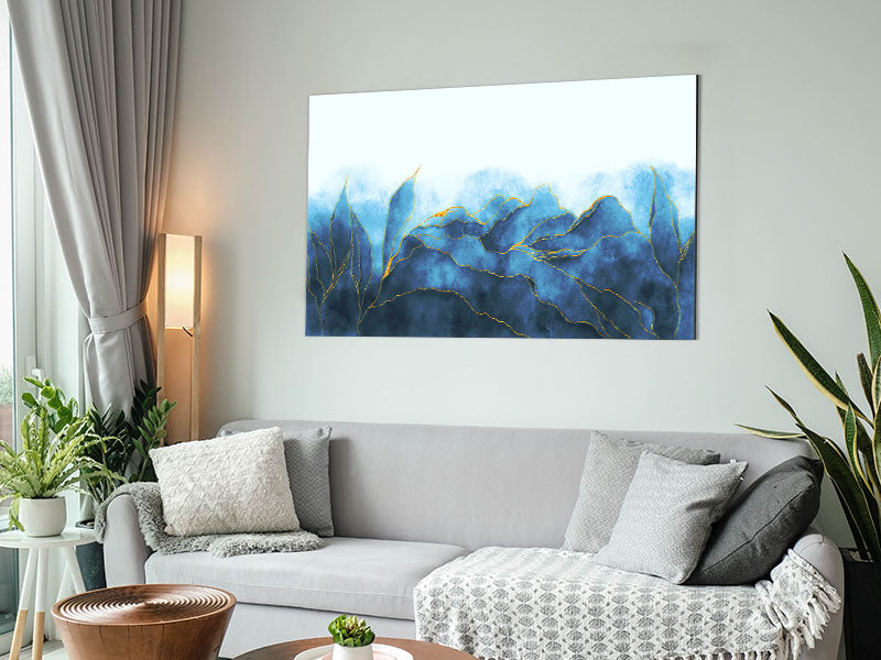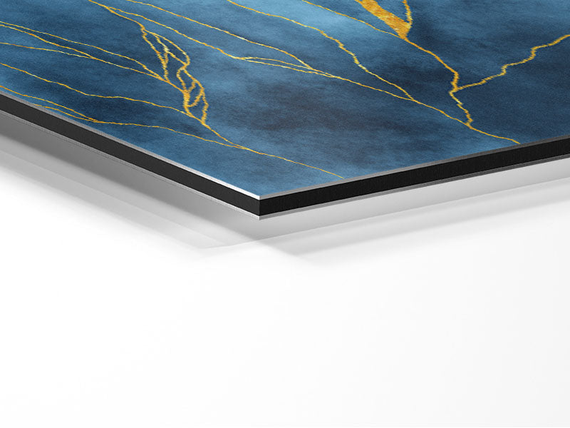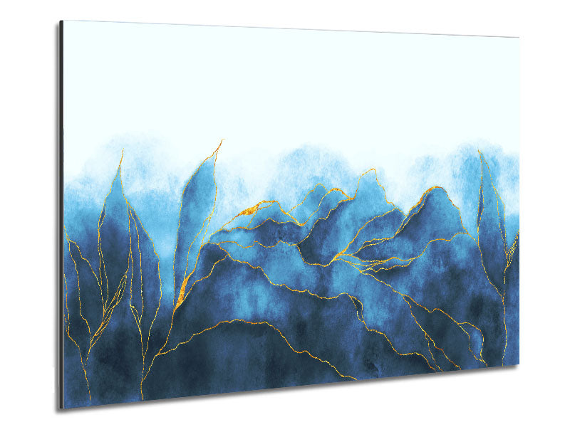 Blue Mists Of Gold Leaf Printed on brushed aluminium dibond. A modern way to display art and easy to maintain.