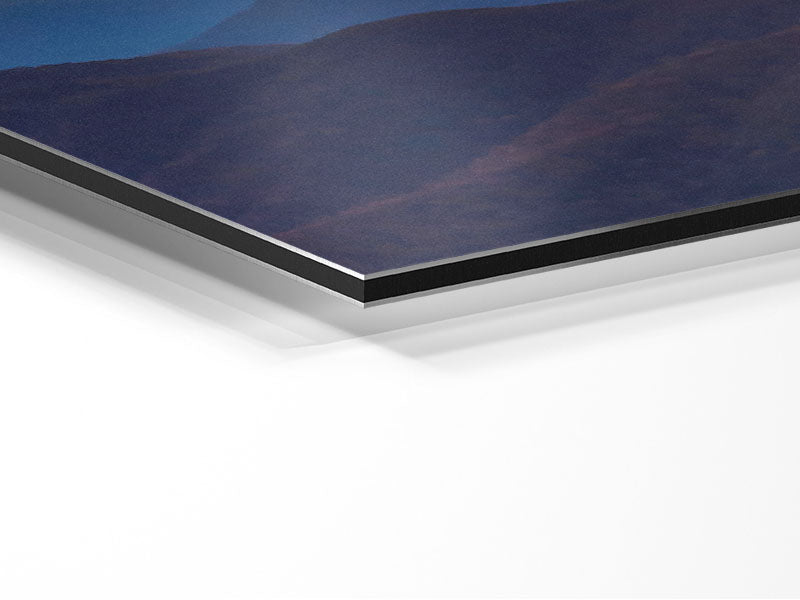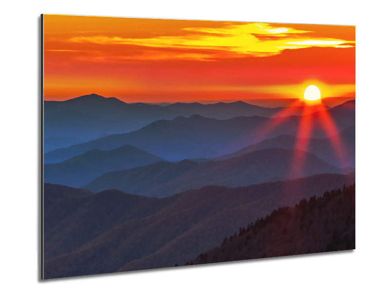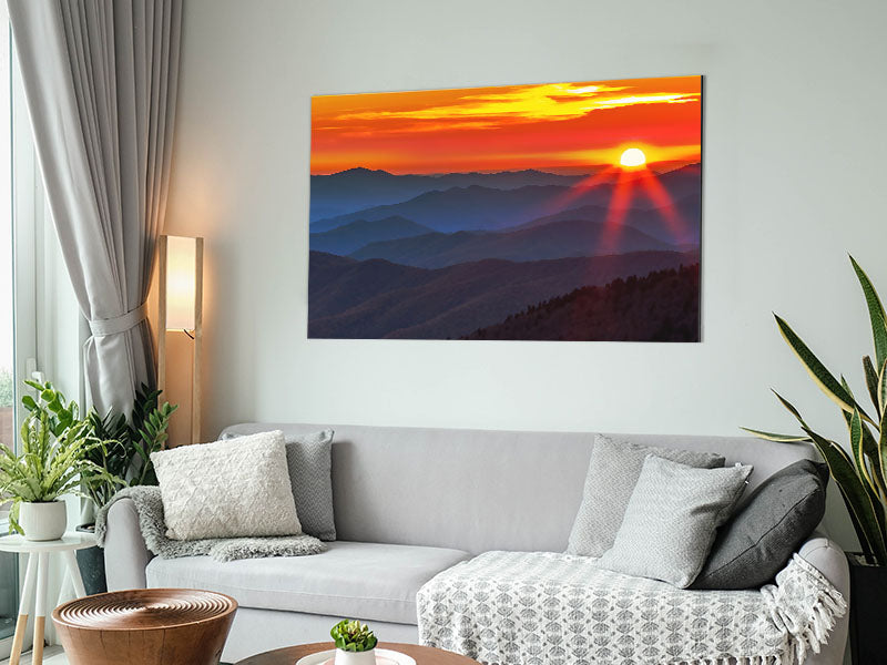 Blue Misty Mountain Sun 3 Printed on brushed aluminium dibond. A modern way to display art and easy to maintain.