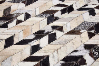 This small rug is a bold and visually dynamic piece that combines the natural beauty of hair-on leather with a modern geometric pattern. The eye-catching rug features a contemporary chevron pattern created from a patchwork of black, white, brown, and cream cowhide. The bold geometric layout adds visual interest and a sense of direction to the floor, making it a perfect focal point for living rooms, dining areas, or hallways.