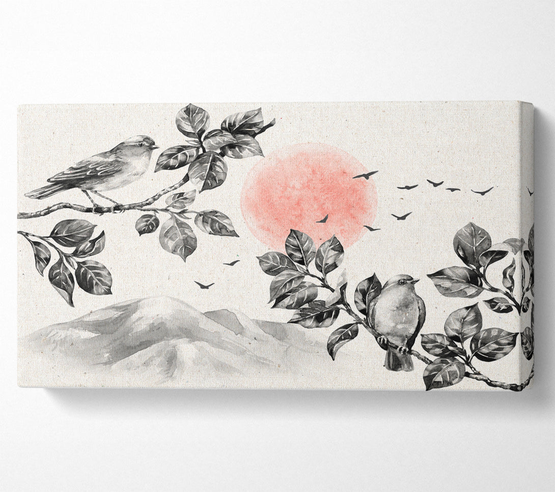 Branches Over The Japanese Sunet wide canvas, printed on coated polyester canvas. Mounted on to a 44mm box frame, ready to hang.