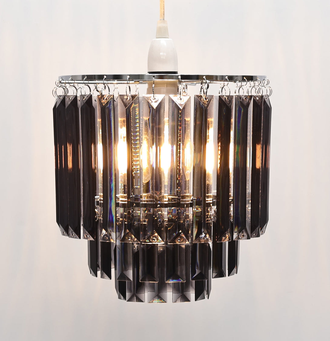 Add a touch of luxury to your lighting with the Bria Smoked Easy-Fit Pendant, exclusive to Pagazzi. This elegant pendant features a striking 3-tier shade made from cascading smoked acrylic prisms, creating a glamorous, light-reflecting statement in any space.