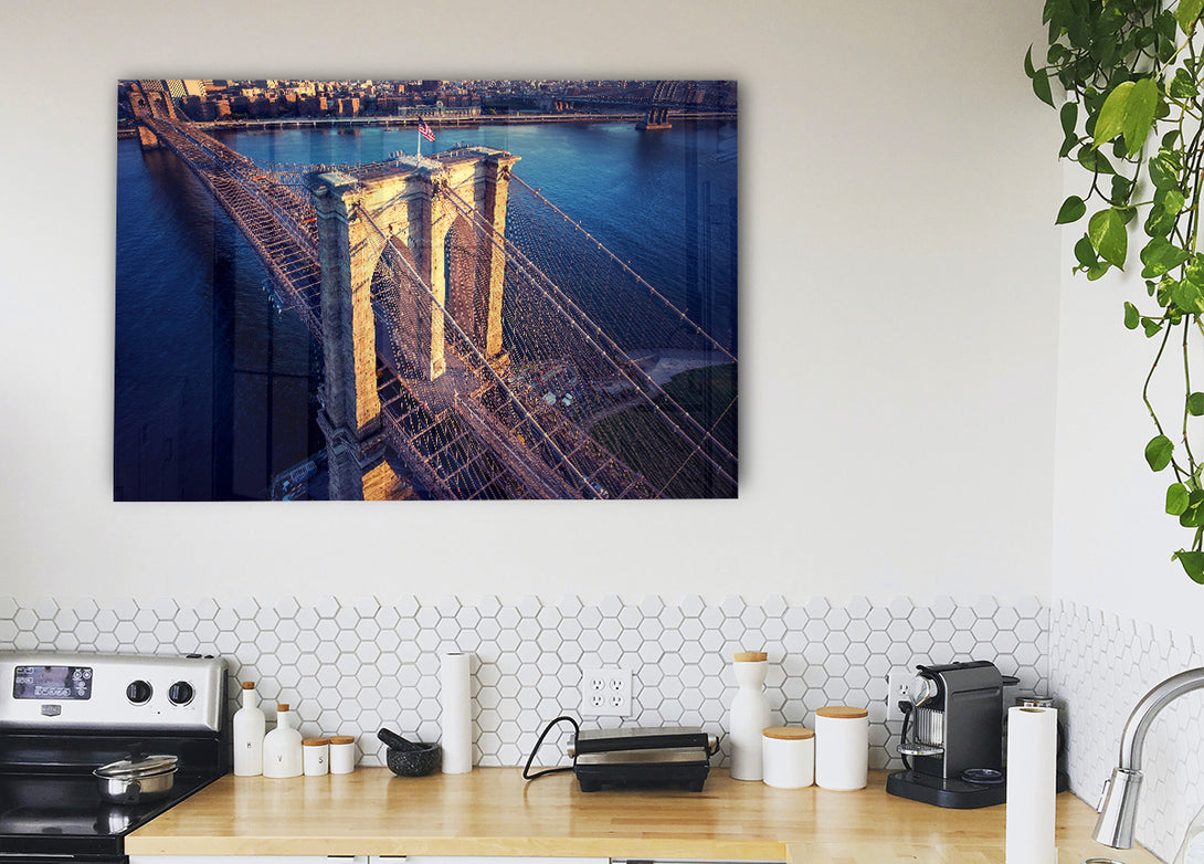 Brooklyn Bridge Above acrylic print, UV printed onto 5mm thick acrylic glass. Comes with everything you need to hang on your wall.
