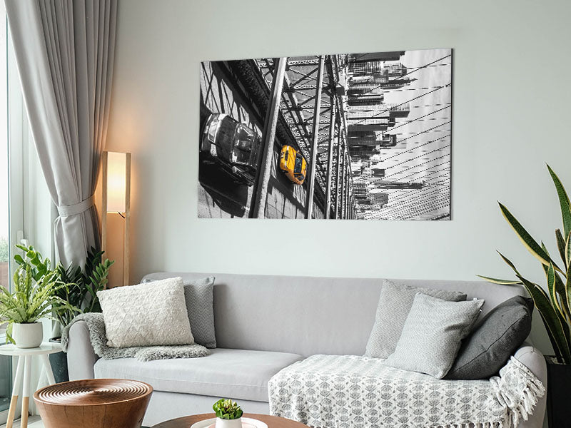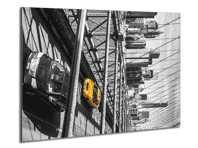 Brooklyn Bridge Yellow Cab NYC Printed on brushed aluminium dibond. A modern way to display art and easy to maintain.