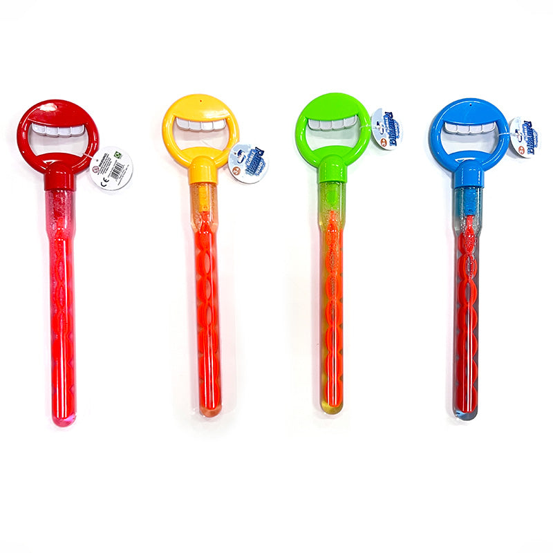 This bubble stick is great fun for young children, and incorporates a zany smiley face in the handle. Bright red, yellow, green or blue - one supplied at random.Approximate product dimensions: (H) 45cm x (W) 10cm x (D) 3cmPlease note: lifestyle photographs for illustration, 1x product listed supplied only. Colours and designs may be updated or vary slightly. Please read all packaging and instructions thoroughly before use.