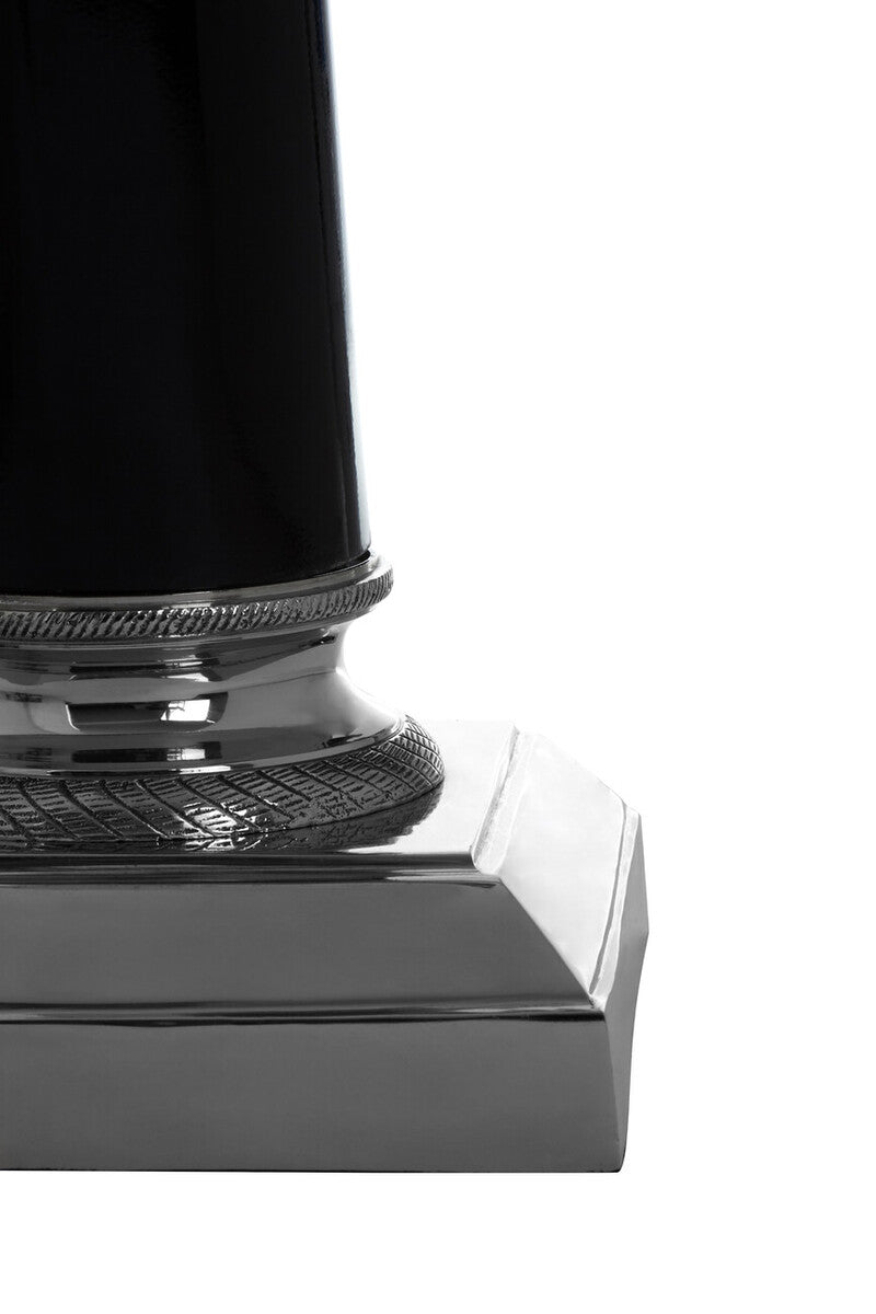 ""This lamp has a tiered base with a reflective nickel finish that matches the top and bottom sections of the column. Crosshatch-style etched detail lends texture to the look of this classically-inspired accent piece. The shade is made from tactile fabric,"