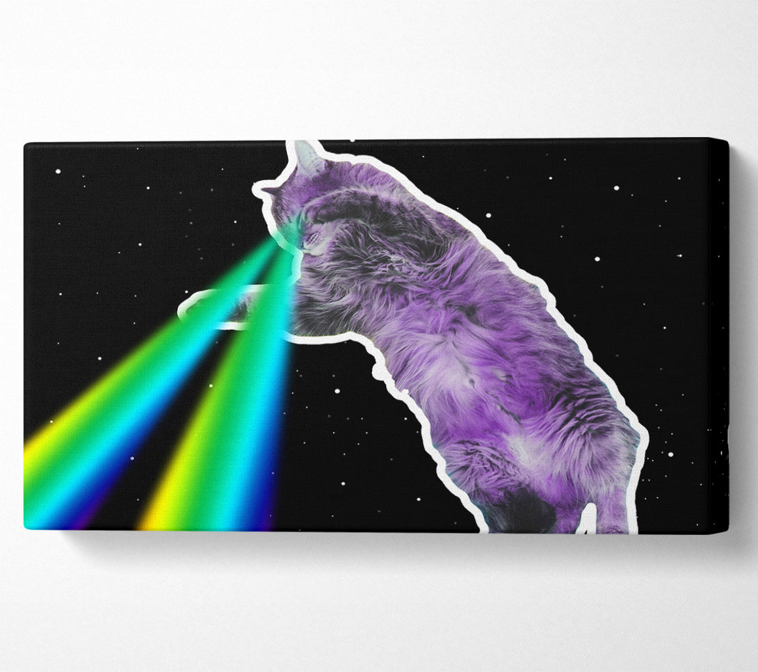 Cat Lazer Beam Space wide canvas, printed on coated polyester canvas. Mounted on to a 44mm box frame, ready to hang.