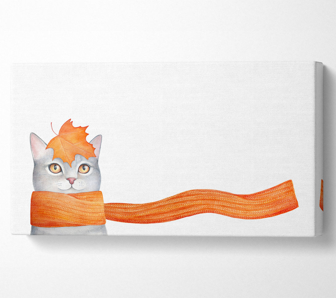 Cat With An Orange Scarf wide canvas, printed on coated polyester canvas. Mounted on to a 44mm box frame, ready to hang.