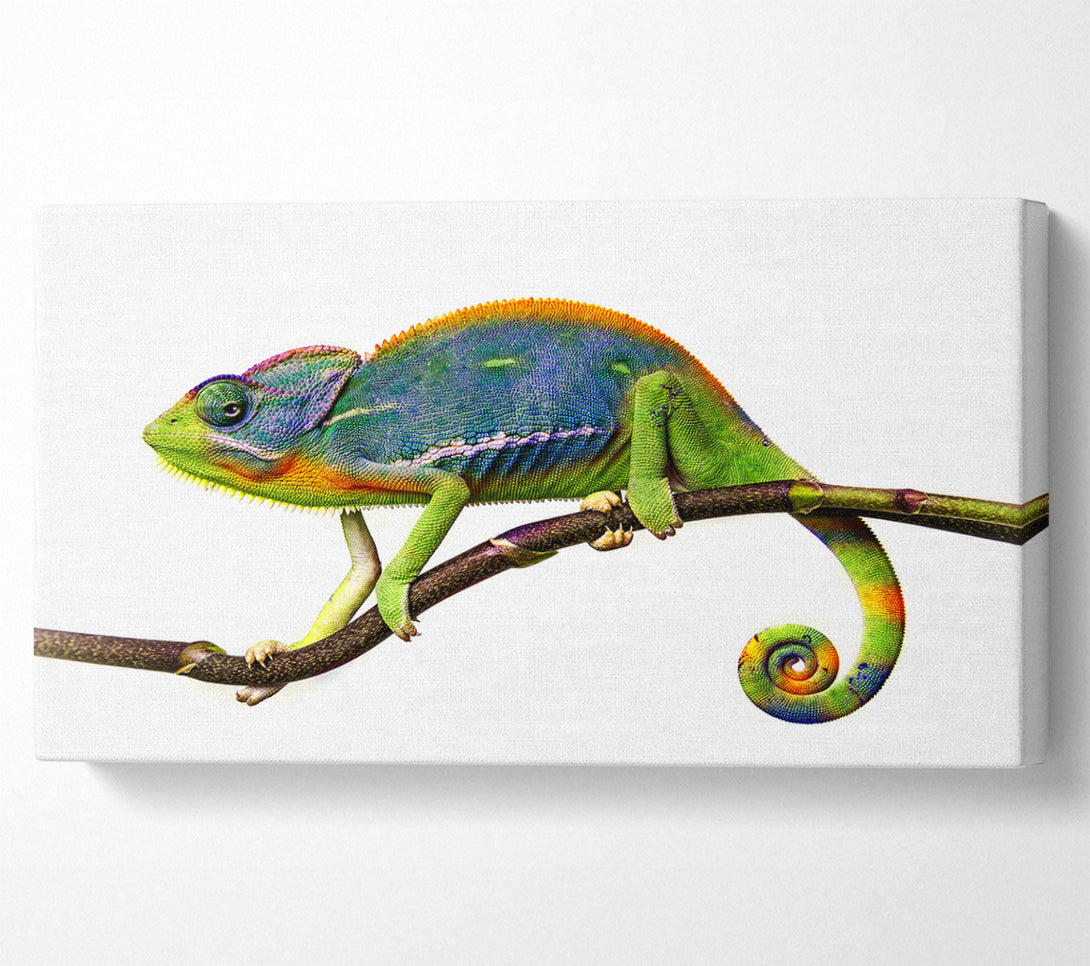 Chameleon Branch wide canvas, printed on coated polyester canvas. Mounted on to a 44mm box frame, ready to hang.