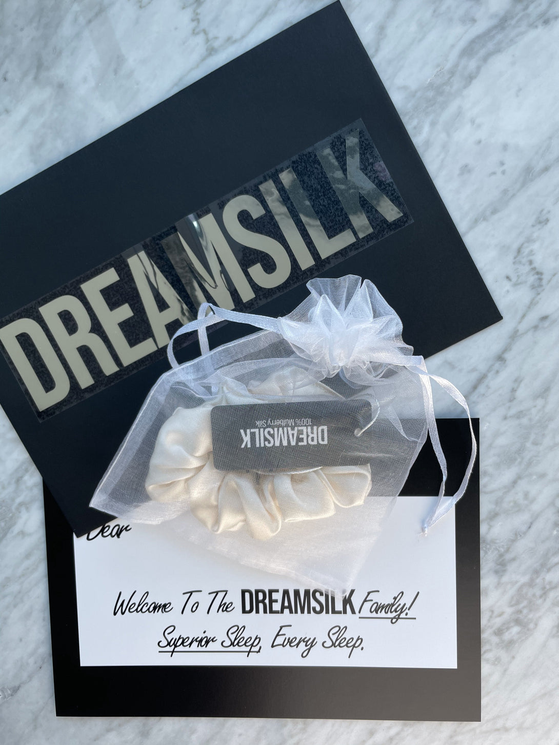 DREAMSILK's™ silk scrunchies that glide over your hair like moonlight over water.