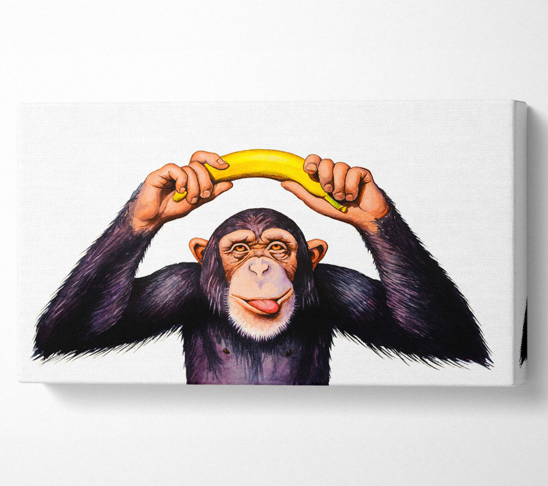 Cheeky Banana Monkey wide canvas, printed on coated polyester canvas. Mounted on to a 44mm box frame, ready to hang.