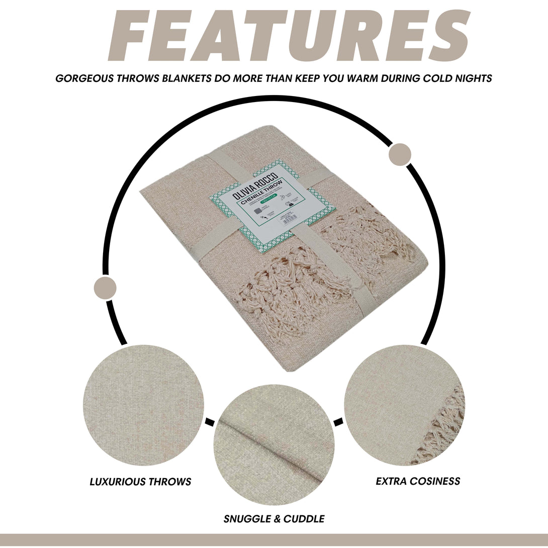 Experience unparalleled comfort and style with our Chenille Throw Blanket with Tassels by OLIVIA ROCCO. Designed to enhance your home decor and provide ultimate coziness, this versatile blanket is perfect for any season. Crafted with meticulous attention to detail, it effortlessly combines warmth, breathability, and luxurious softness, making it a must-have addition to your living space.