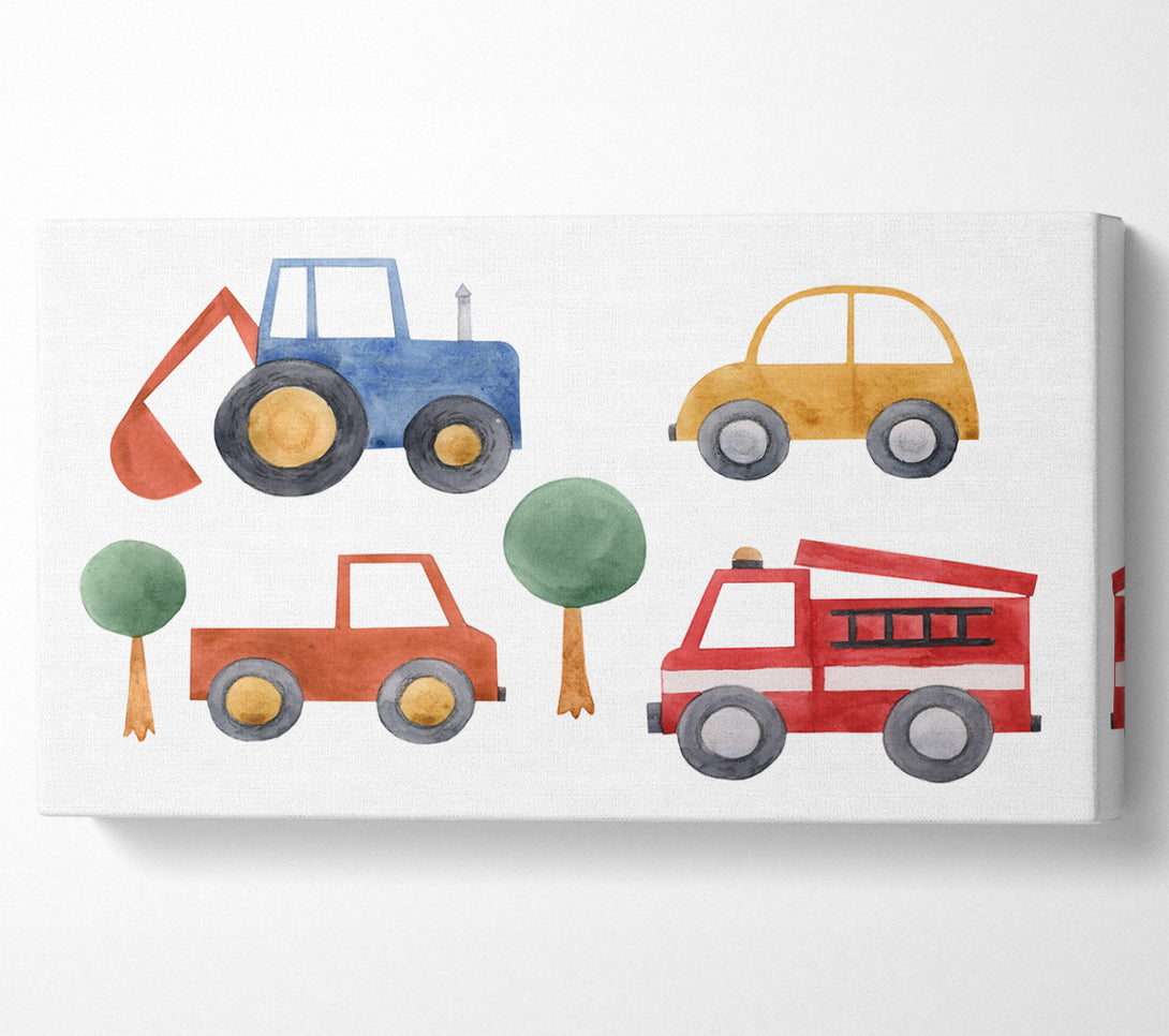 Childrens Vehicle Collection wide canvas, printed on coated polyester canvas. Mounted on to a 44mm box frame, ready to hang.