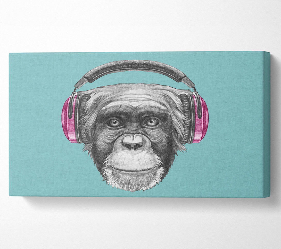 Chimpanzee Headphone Dj wide canvas, printed on coated polyester canvas. Mounted on to a 44mm box frame, ready to hang.
