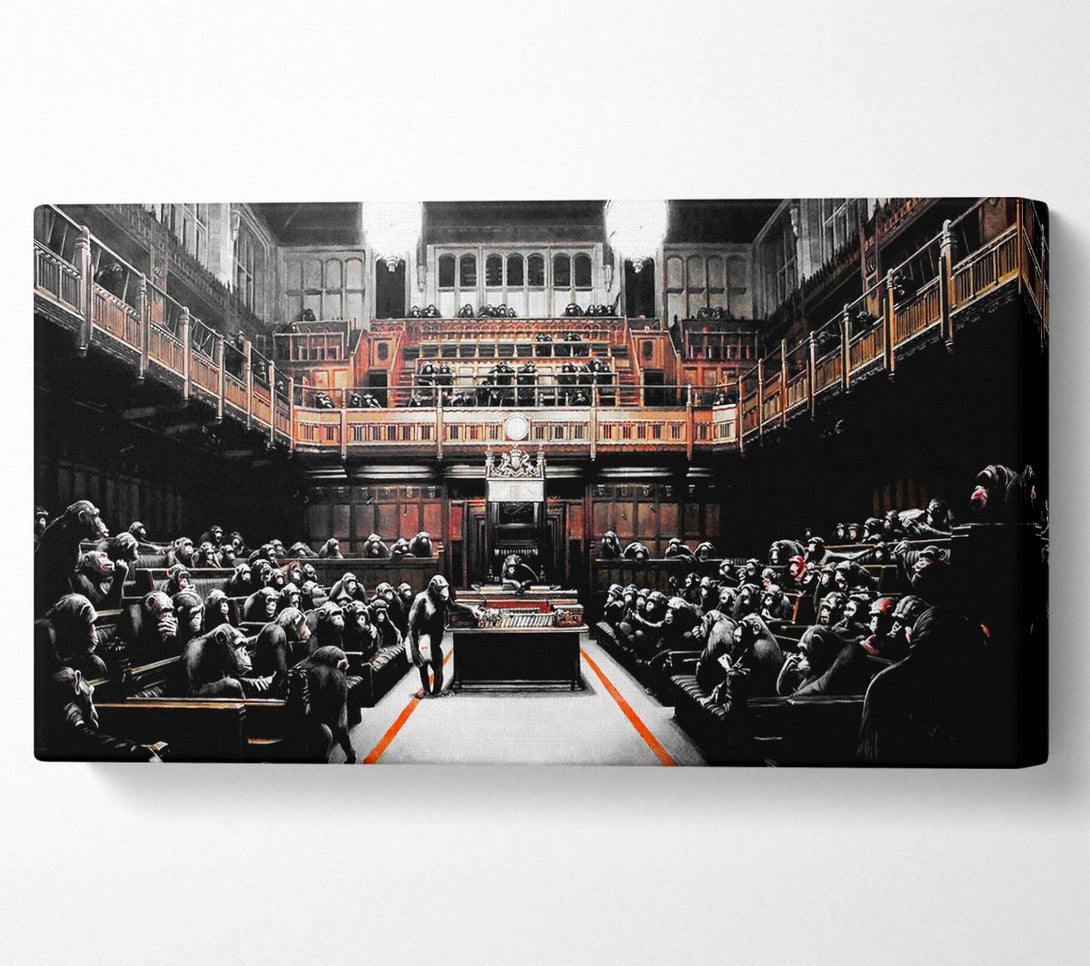 Chimps Houses Of Parliament canvas, printed on coated polyester canvas. Mounted on to a 44mm box frame, ready to hang.