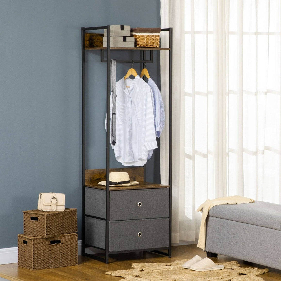Clothes organisation made easier than ever - this freestanding clothes unit from HOMCOM. The design forges a 46cm clothes rail with two bottom drawers and a top shelf - hang dresses, shirts and coats; store trousers, tops and underwear altogether. A strong metal frame supports up to 50kg - great for your personal clothes collection. A stylish design you can use in the bedroom, the hallway and to extend space in the spare room.
