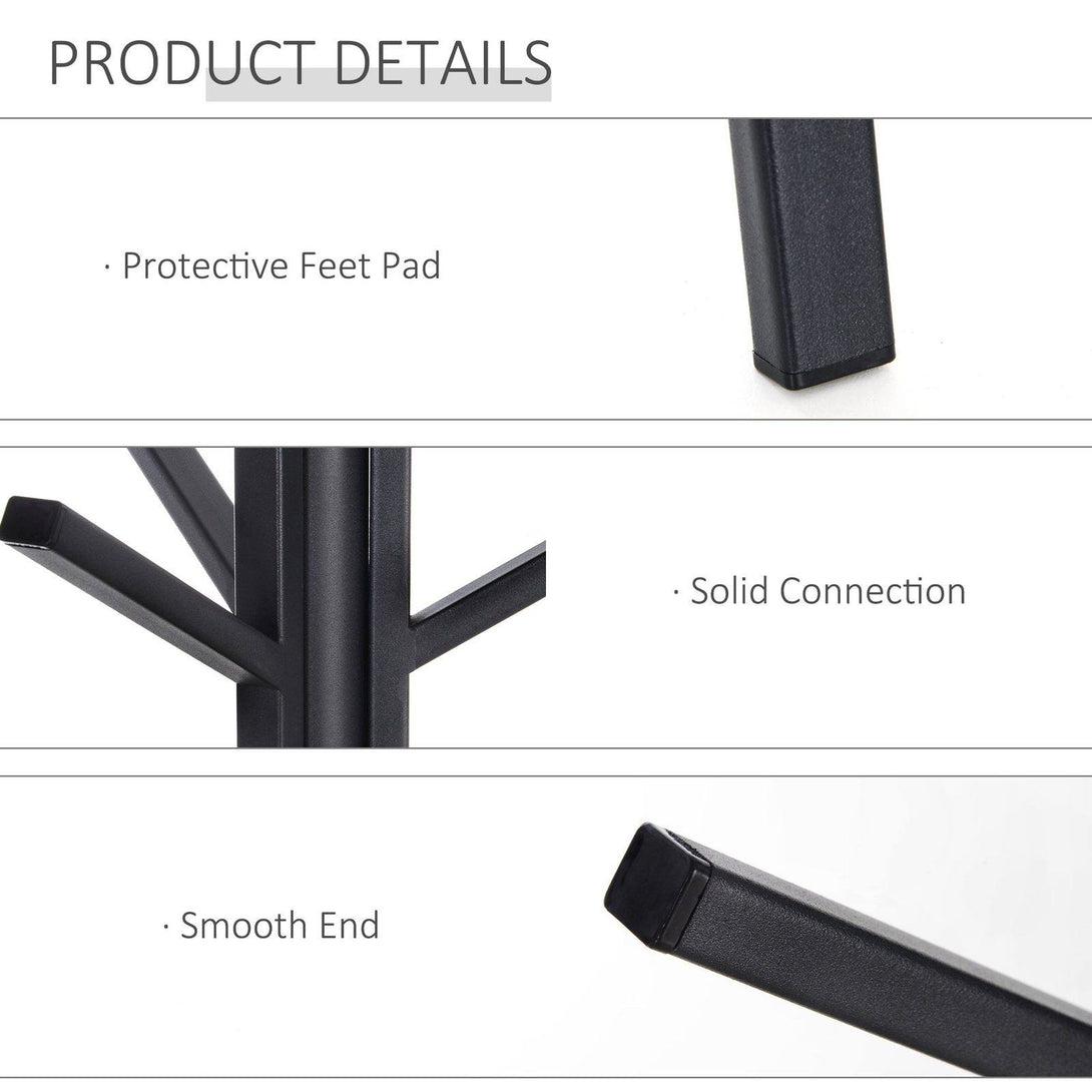 This functional coat rack from HOMCOM is designed to handle your entire family's coats and other heavy garments including clothing accessories such as hats, scarves, and beanies. It combines a freestanding coat rack and a display stand in one easy to use unit. A compact and modern design helps you save in your hallway or entryway. What's more, you can place it in any corner, wherever you want such as the bedroom, garage, or office. Its made from sturdy and strong steel metal with 9 hooks and a bottom shelf for all your belongings.