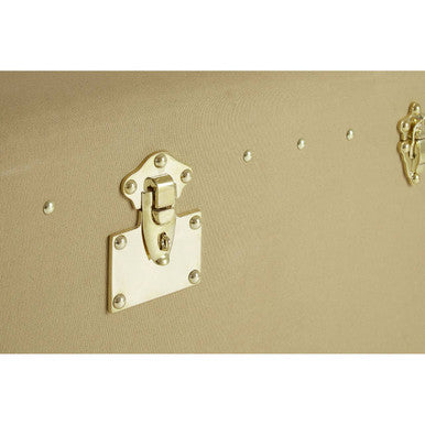 Its case is made from eco-friendly mango wood and is covered with textured canvas. The canvas has a natural colour that complements the brown, genuine leather detail at the corners and sides. Its side drawers feature coordinating leather handles, while the stud detail complements the metal clasp locks that secure its lid.