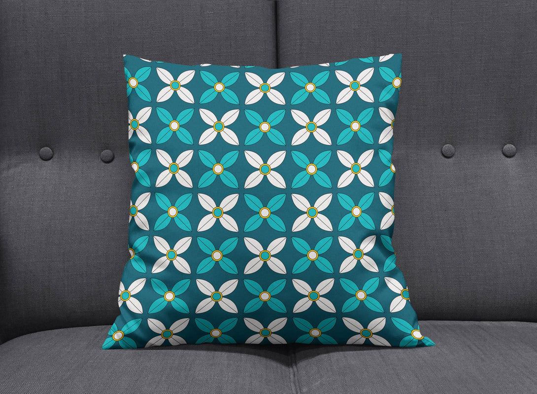 Dark Blue Cushion with White and Blue Geometric Floral Design, Throw Pillow