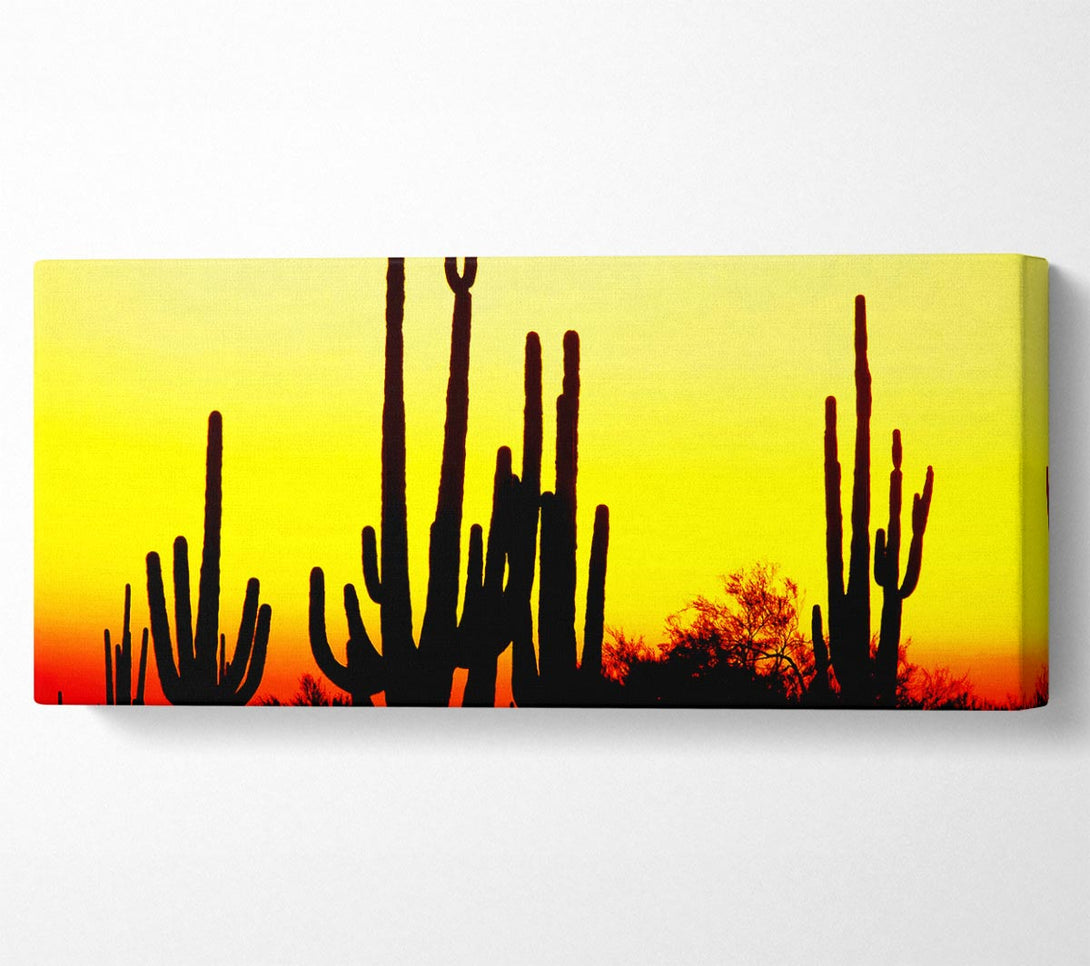 Desert Cactus Sunrise canvas, printed on coated polyester canvas. Mounted on to a 44mm box frame, ready to hang.