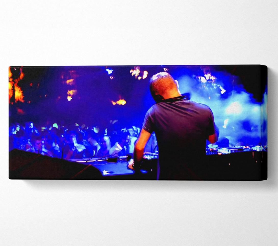 Dj Mixing canvas, printed on coated polyester canvas. Mounted on to a 44mm box frame, ready to hang.