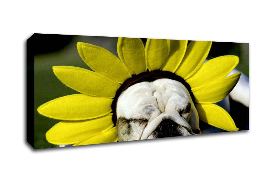 Dog Sunflower Hat canvas, printed on coated polyester canvas. Mounted on to a 44mm box frame, ready to hang.