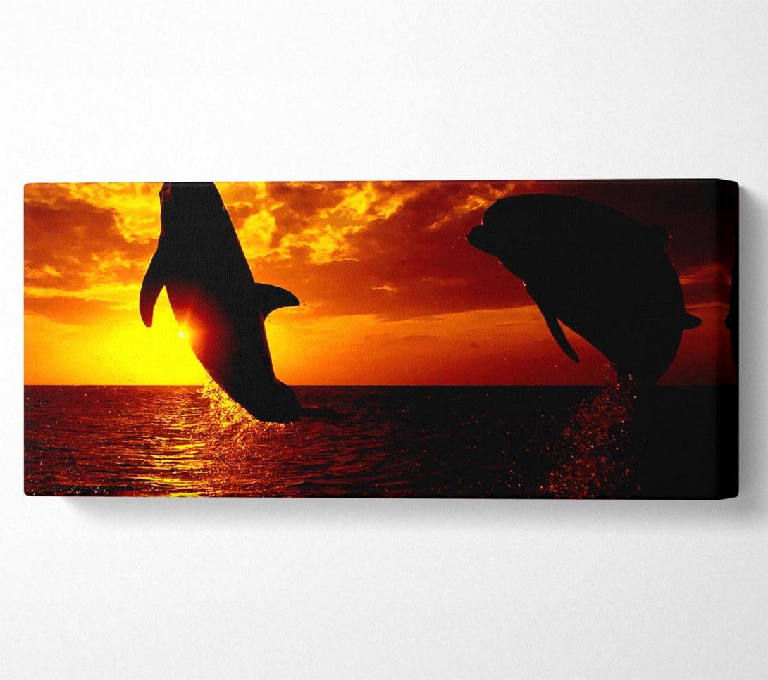 Dolphins Sunglow canvas, printed on coated polyester canvas. Mounted on to a 44mm box frame, ready to hang.
