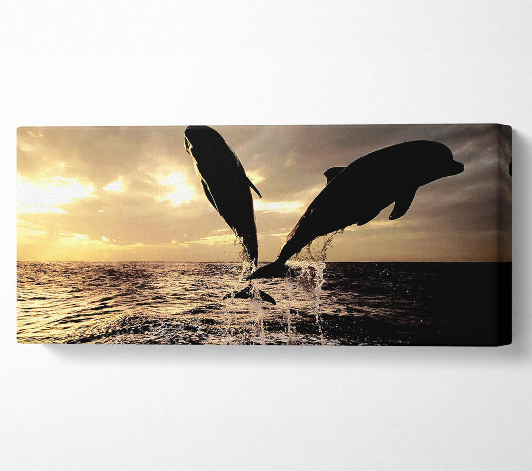 Double Dolphin Jump canvas, printed on coated polyester canvas. Mounted on to a 44mm box frame, ready to hang.