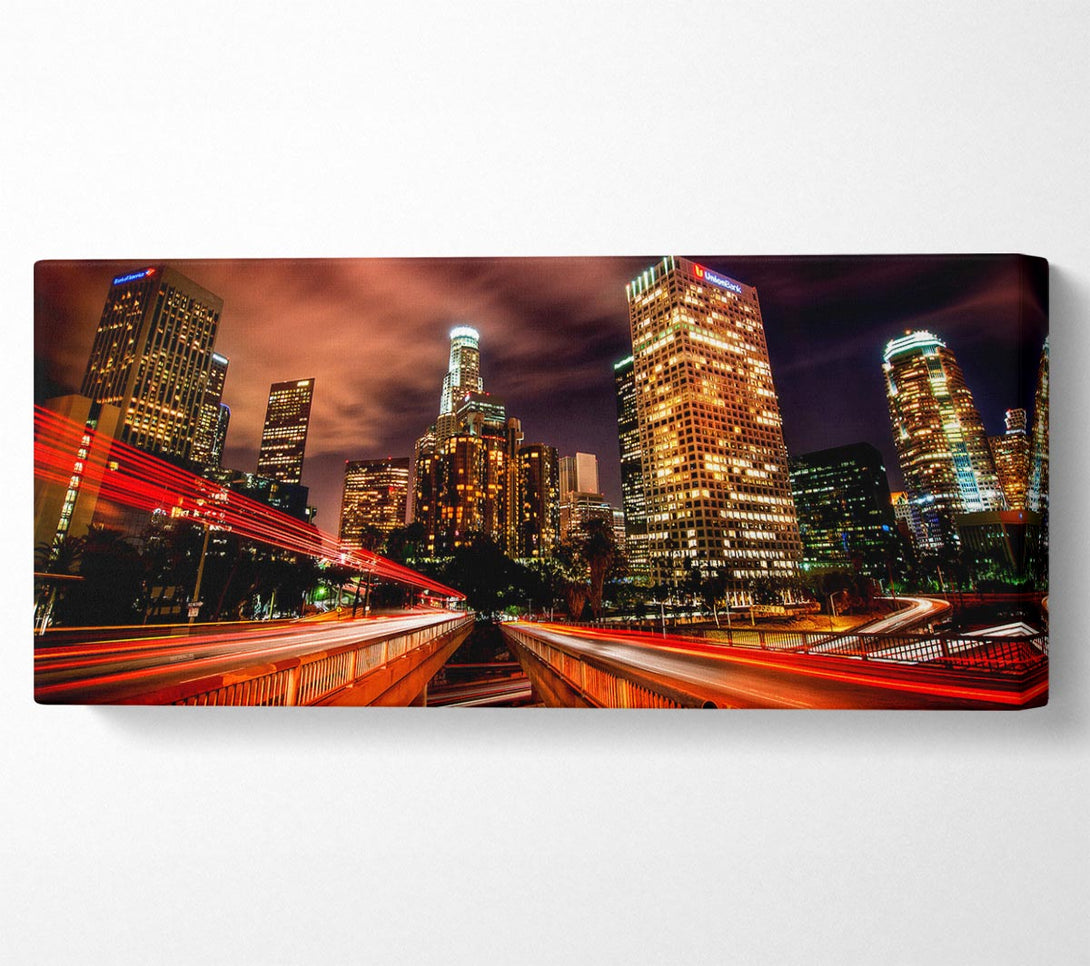 Downtown Los Angeles At Night canvas, printed on coated polyester canvas. Mounted on to a 44mm box frame, ready to hang.