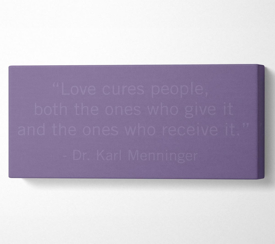 Dr Karl Menninger Love Cures People Lilac canvas, printed on coated polyester canvas. Mounted on to a 44mm box frame, ready to hang.