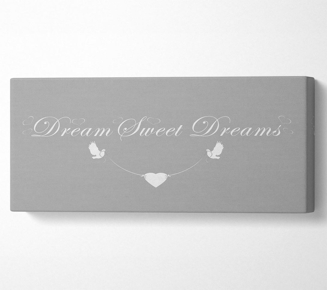 Dream Sweet Dreams Grey White canvas, printed on coated polyester canvas. Mounted on to a 44mm box frame, ready to hang.