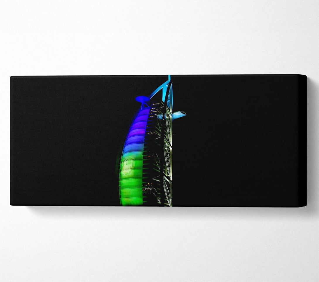 Dubai Building Green Blue canvas, printed on coated polyester canvas. Mounted on to a 44mm box frame, ready to hang.