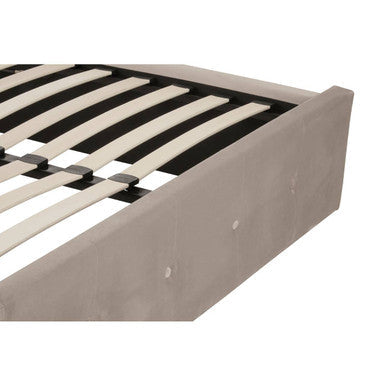 The Edison mink double ottoman bed has a brushed velvet upholstered headboard in diamond pattern tufting that creates an elegant visual appeal. Its rolled top is slightly curved from the sides to form a wingback style. The natural wood frame will provide long-lasting durability while padding across all sides gives it an aesthetically pleasing look.