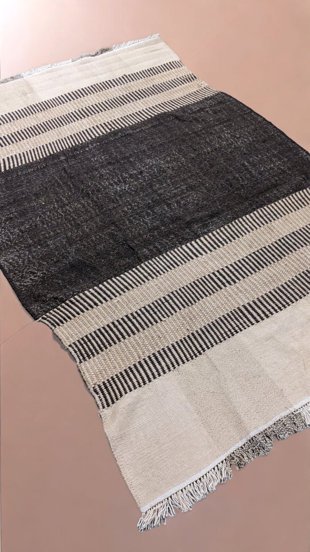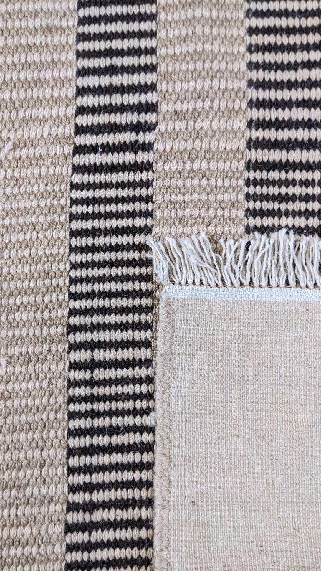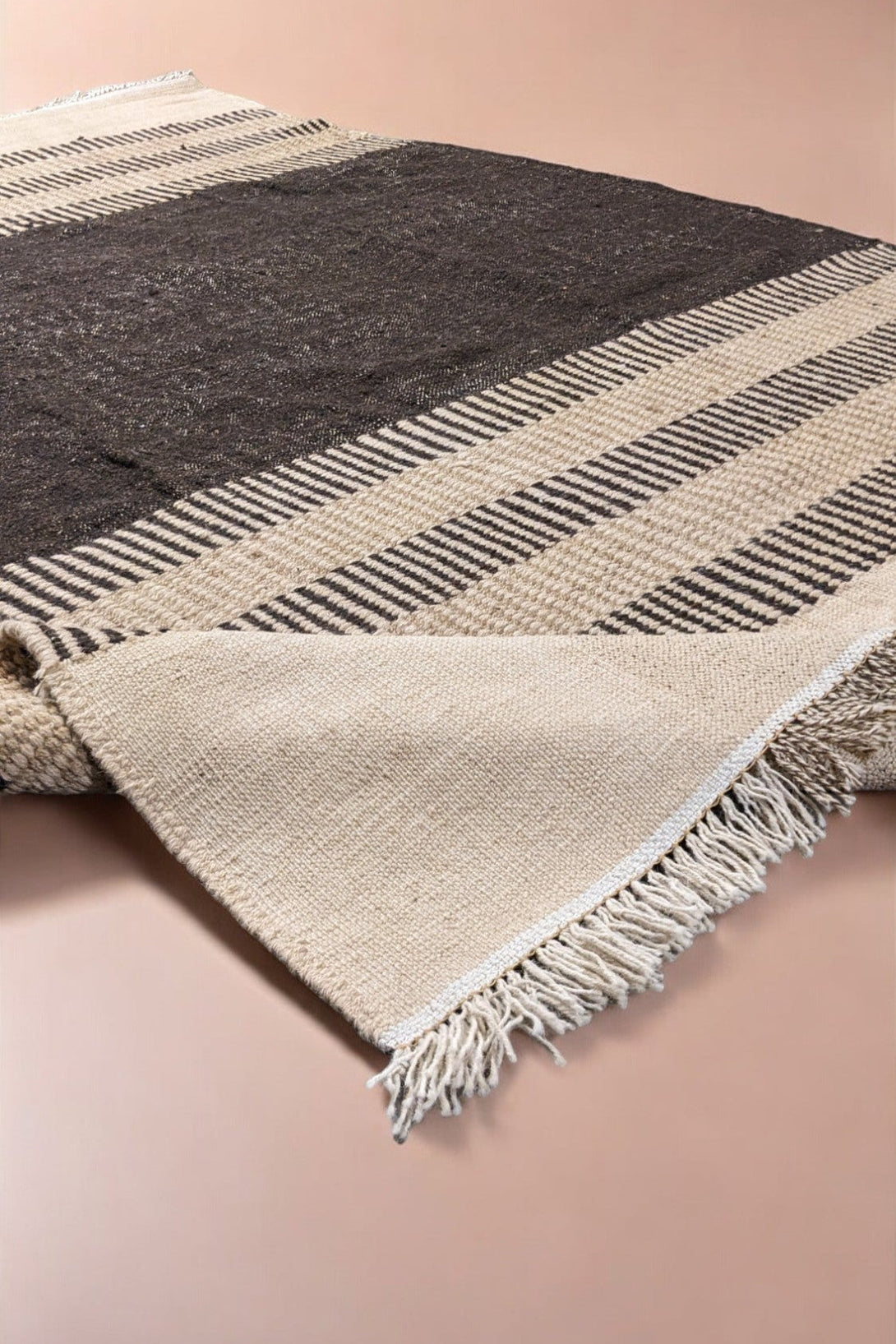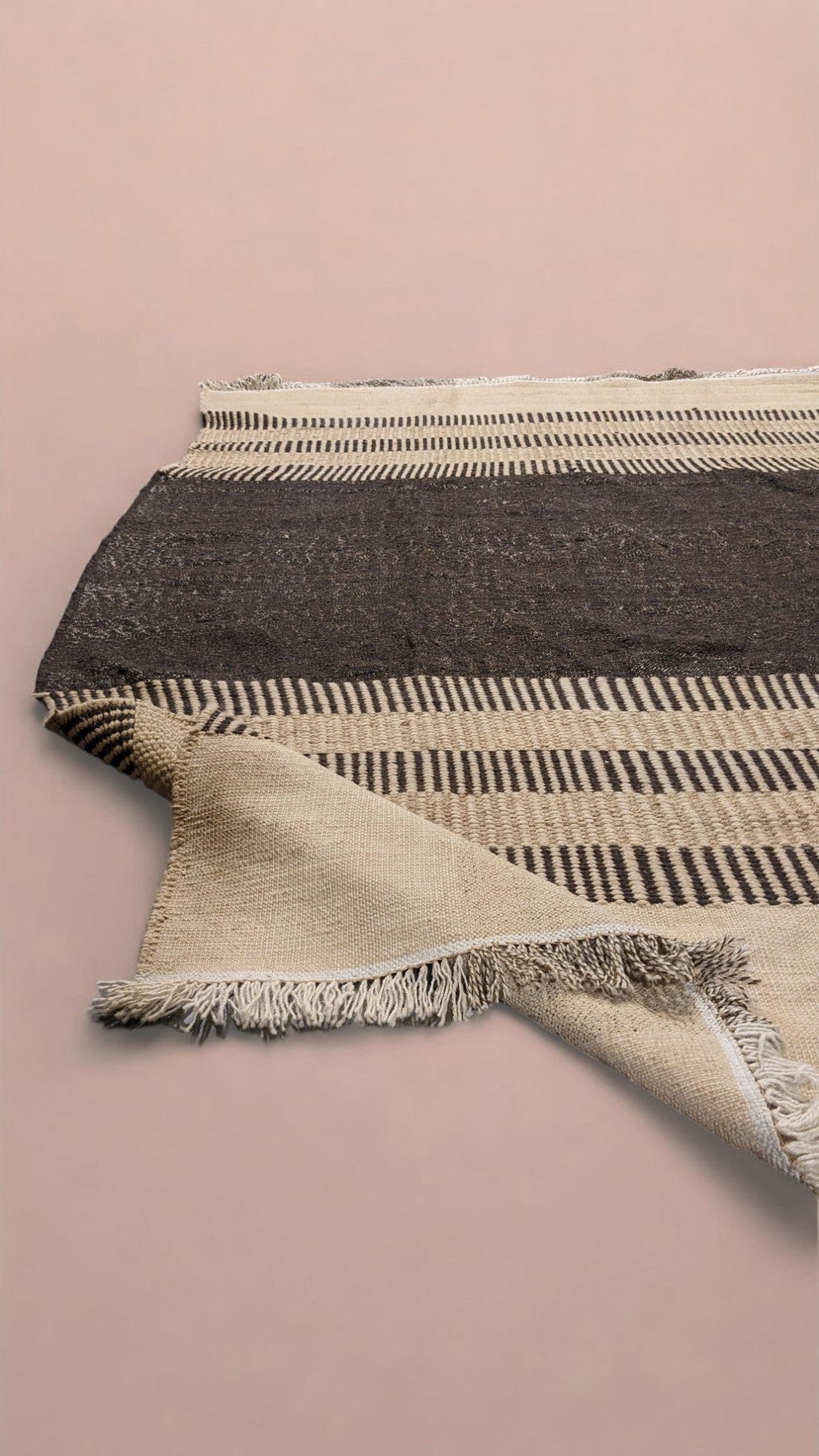 Ground breaking flat-weave rug, Elara, blends innovative design with age-old skill. A textured masterpiece is produced by gradient effects, vivid colours, and vertical borders. Classy and scorching the deep brown colour of this valuable wool piece promotes creativity and longevity in any interior setting.
